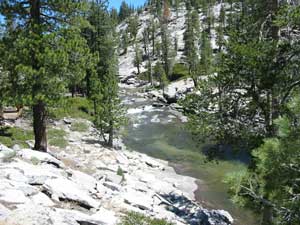 Yosemite Creek down in the ravineIt came as a relief when green and tall vegetation came back to existence. Shade slowly replaced the light on the floor as we moved forward and we were more than glad to walk under the green canopy.