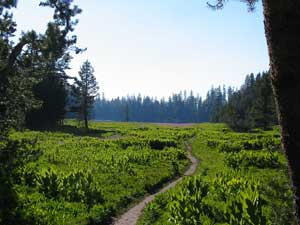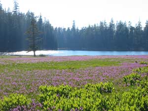 We sort of waded along the path as the small but tall plants, a little bit taller than me grew into the edge of the trail. Merely roughly 50 meters later, the tall green-stem plant stopped its infiltration as a smaller species took dominance. With the lack of the green-stem plants, Lukens Lake was visible under the completely clear blue sky. On its background, confiner trees are everywhere and just before the lake, purple flowers are as many as the mosquitoes, making the sight as pretty as a well-painted picture (in fact, better!).